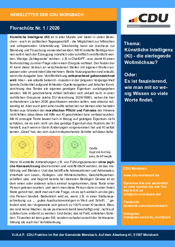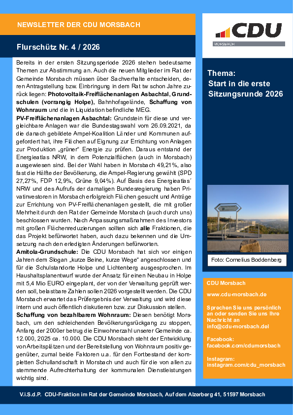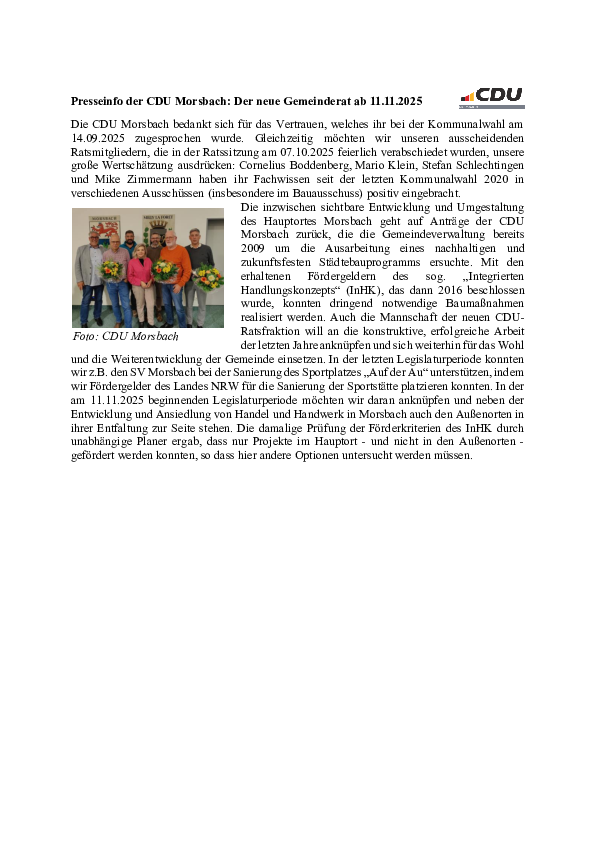Ende Januar kamen Mitglieder der CDU-Fraktion und des -Gemeindeverbandes zusammen, um sich in einem Ganztagsseminar über die Grundlagen der Kommunalpolitik zu informieren und die für sie sich daraus ergebenden Aufgaben zu erarbeiten. Im Grundgesetz Artikel 21 Abs. 1 ist festgelegt, dass die Parteien bei der politischen Willensbildung des Volkes mitwirken und ihre innere Ordnung demokratischen Grundsätzen entsprechen muss. Die Kommunalverfassung regelt gemeindliche Belange, wobei dem für fünf Jahre gewählten Gemeinderat laut Gemeindeordnung NRW der Auftrag zufällt, über den Haushalt, Satzungen und große Vorhaben oder Projekte zu entscheiden und seine Kontrollfunktion gegenüber der Verwaltung wahrzunehmen. Die Geschäftsordnung für den Rat und die Ausschüsse in Morsbach definiert Rechte und Abläufe in diesen Gremien bzw. deren Sitzungen. In verschiedenen Paragraphen sind z. B. Änderungen der Tagesordnung, Redeordnung und Anträge geregelt. Anträge der Fraktionen sind wichtige Handlungsinstrumente: Sie werden zu bestimmten Anlässen oder konkreten Fragen gestellt, um Informationen zu erhalten oder Anregungen sowie (Prüf-)Aufträge an die Gemeindeverwaltung zu geben. In den Sitzungen der Fachausschüsse oder des Rates wird über die Anträge abgestimmt. Im praxisnah gestalteten Seminar wurden Anliegen aus der Bürgerschaft und Ziele der CDU-Fraktion zu Maßnahmen und Handlungsempfehlungen formuliert. Die aus unserer Sicht relevantesten Themen wurden von allen Teilnehmenden bewertet und danach in einen konkreten inhaltlichen Forderungs-, Handlungs- und Aktionsleitfaden für Anträge der CDU-Fraktion Morsbach umgewandelt. Dieses gemeinsam aufgestellte Konzept werden wir für unsere kommende Fraktionsarbeit nutzen, um Ideen zu plazieren, Projekte anzustoßen und Auskünfte bei der Verwaltung anzufragen.